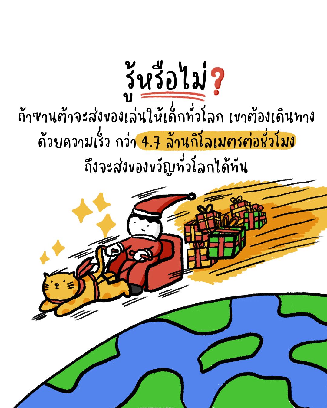 รู้หรือไม่ ถ้าซานต้าอยากจะส่งของขวัญให้เด็กทั่วโลก เขาต้องเดินทางด้วยความเร็วกว่า 4.7 ล้านกิโลเมตรต่อชั่วโมง ถึงจะส่งของขวัญทั่วโลกได้ทัน