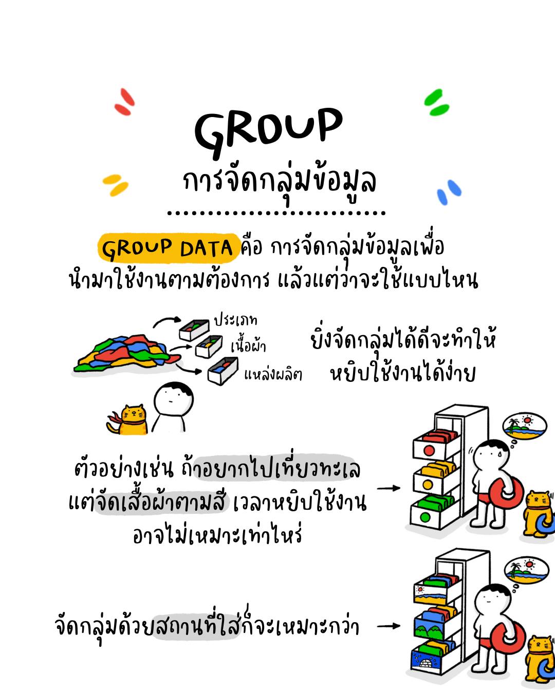 Group Data คือการจัดกลุ่มข้อมูลเพื่อนำมาใช้งานตามต้องการ แล้วแต่ว่าจะใช้งานแบบไหน