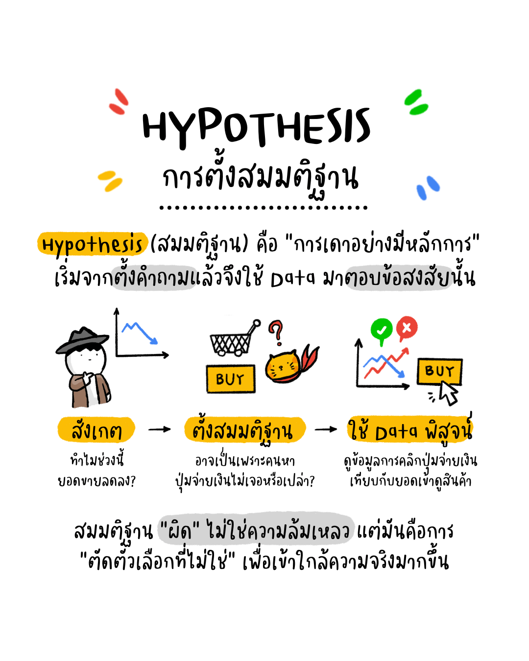 Hypothesis (สมมติฐาน) คือ “การเดาอย่างมีหลักการ” เริ่มจากตั้งคำถามแล้วจึงใช้ Data มาตอบข้อสงสัยนั้น